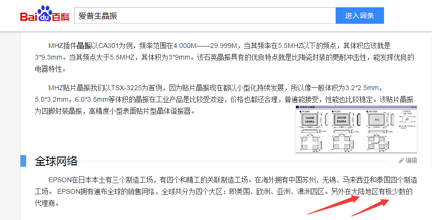 百度是個好東西 ,首先我們可以百度百科下愛普生晶振或者EPSON晶振,如下圖所示:
