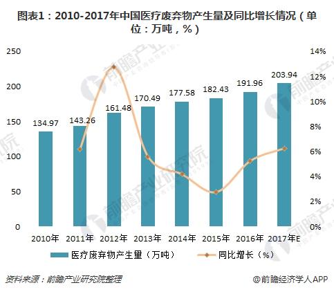 近年來,伴隨著醫學技術進步及人民生活水平、健康狀況的提高,臨床上大量使用一次性醫療衛生用品,醫療廢棄物的產生量大幅提升。據前瞻產業研究院測算,2016年,我國醫療廢棄物產生量已達到191.96萬噸,同比增長5.22%。