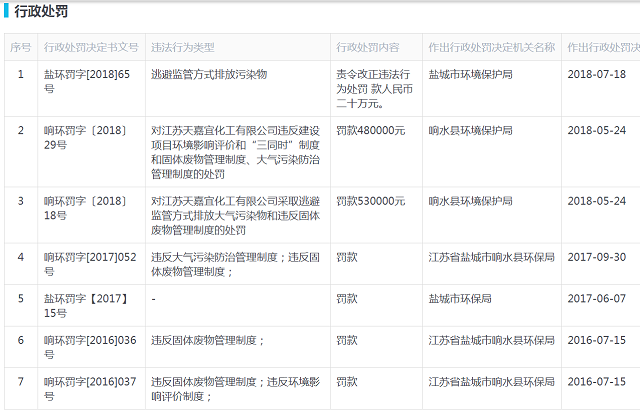 經啟信寶查詢,2018年5月24日,天嘉宜化工被響水縣環境保護局處罰,[響環罰字〔2018〕29號]決定文書介紹,依據《建設項目環境保護管理條例》第二十三條、《中華人民共和國環境影響評價法》第三十一條、《中華人民共和國大氣污染防治法》第一百零七條、《中華人民共和國固體廢物污染環境防治法》第七十五條,天嘉宜化工被罰款480000元。最近的一次是2018年7月18日,因逃避監管方式排放污染物,被鹽城市環境保護局責令改正違法行為,并處罰款人民幣20萬元。