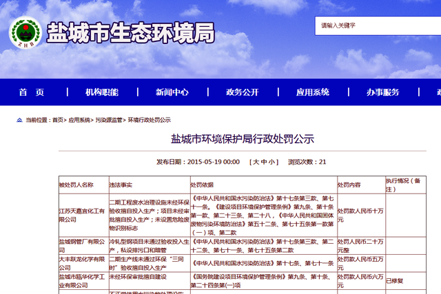 鹽城市環境保護局2015年5月19日公布的行政處罰公示顯示,江蘇天嘉宜化工有限公司二期工程廢水治理設施未經環保驗收擅自投入生產;未設置危險廢物識別標志,處罰款人民幣10萬元。