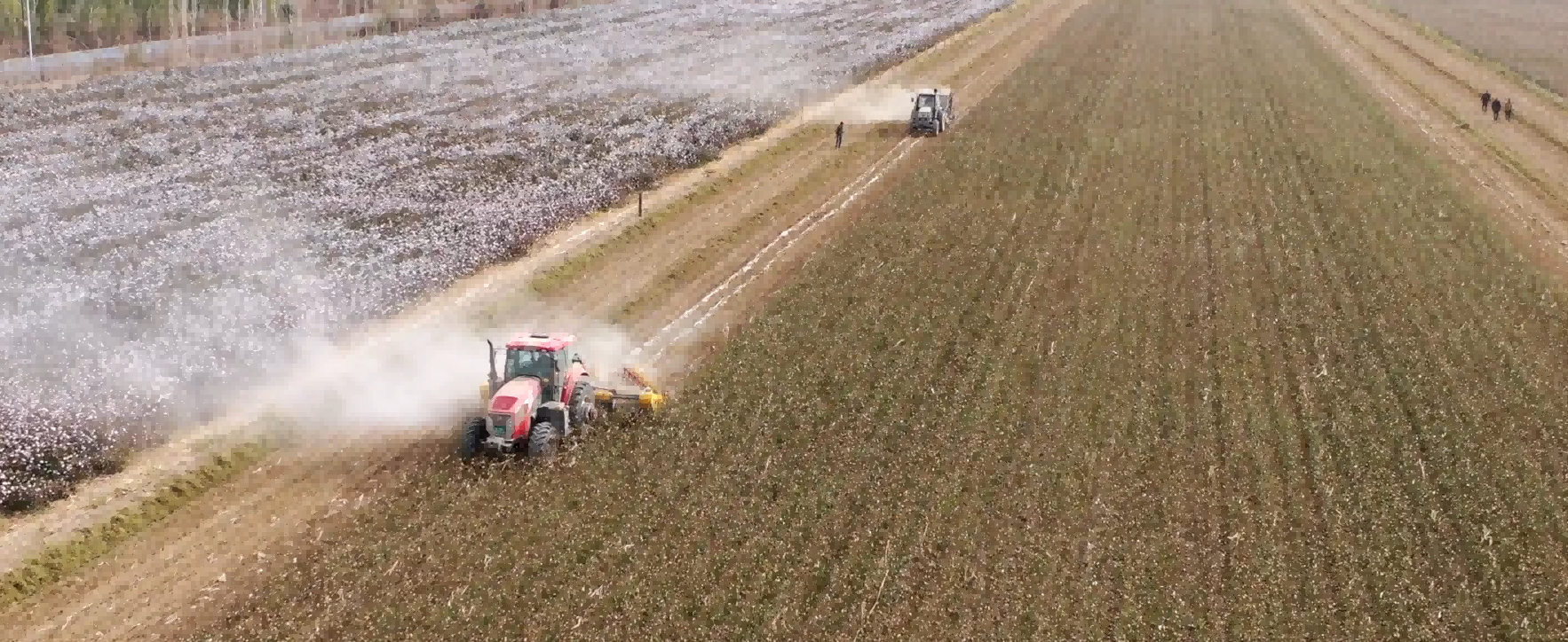 近日,巴州惠疆在尉犁縣及哈密地區(qū)的農(nóng)田殘膜回收工作正在緊鑼密鼓、如火如荼的進(jìn)行中,打桿機(jī)將棉田中的棉桿打斷粉碎處理,打桿機(jī)后方的摟膜裝置將鋪在棉田地上的殘膜進(jìn)行聚攏,殘膜回收機(jī)在田地里來(lái)回穿梭,殘膜被機(jī)器的卷筒快速卷起,集中回收到后置的聚膜框中,機(jī)械所過(guò)之處,棉田干凈平整,殘膜回收率能夠達(dá)到90%以上。?