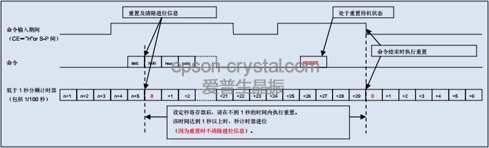 RESET位設(shè)定為”1”后,計(jì)時(shí)電路的低于1秒的計(jì)時(shí)器將在命令結(jié)束時(shí)被重置。欲在特定時(shí)間開始準(zhǔn)確計(jì)時(shí)時(shí),可在設(shè)定時(shí)間后進(jìn)行重置,之后將每秒更新秒位計(jì)時(shí)器。